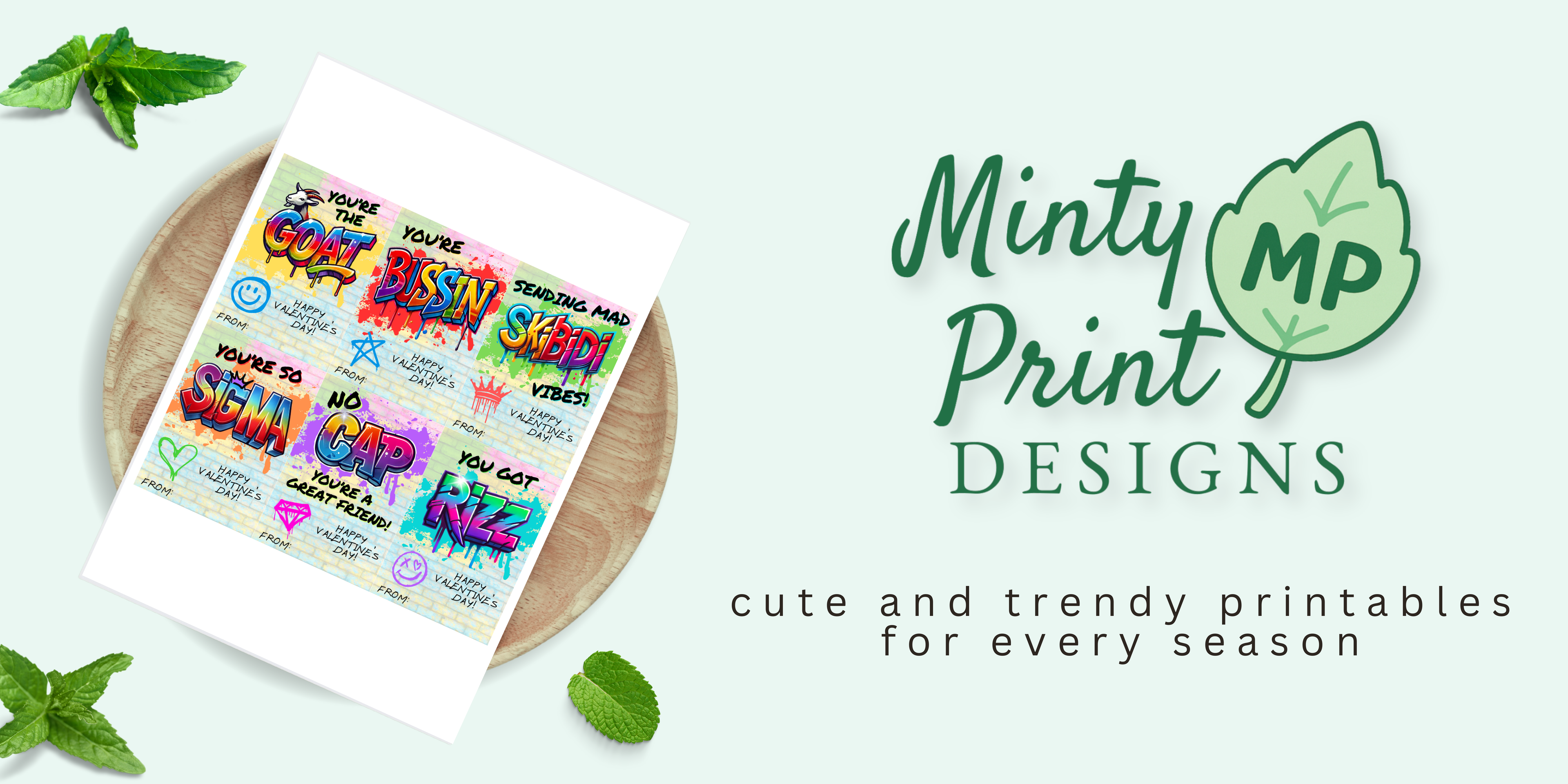 Printable Slang Word Valentines for Older Kids & Middle School – Set of 6 (GOAT, Bussin, Skibidi, Sigma, Cap & Rizz) | Kids Classroom Cards | Instant Download